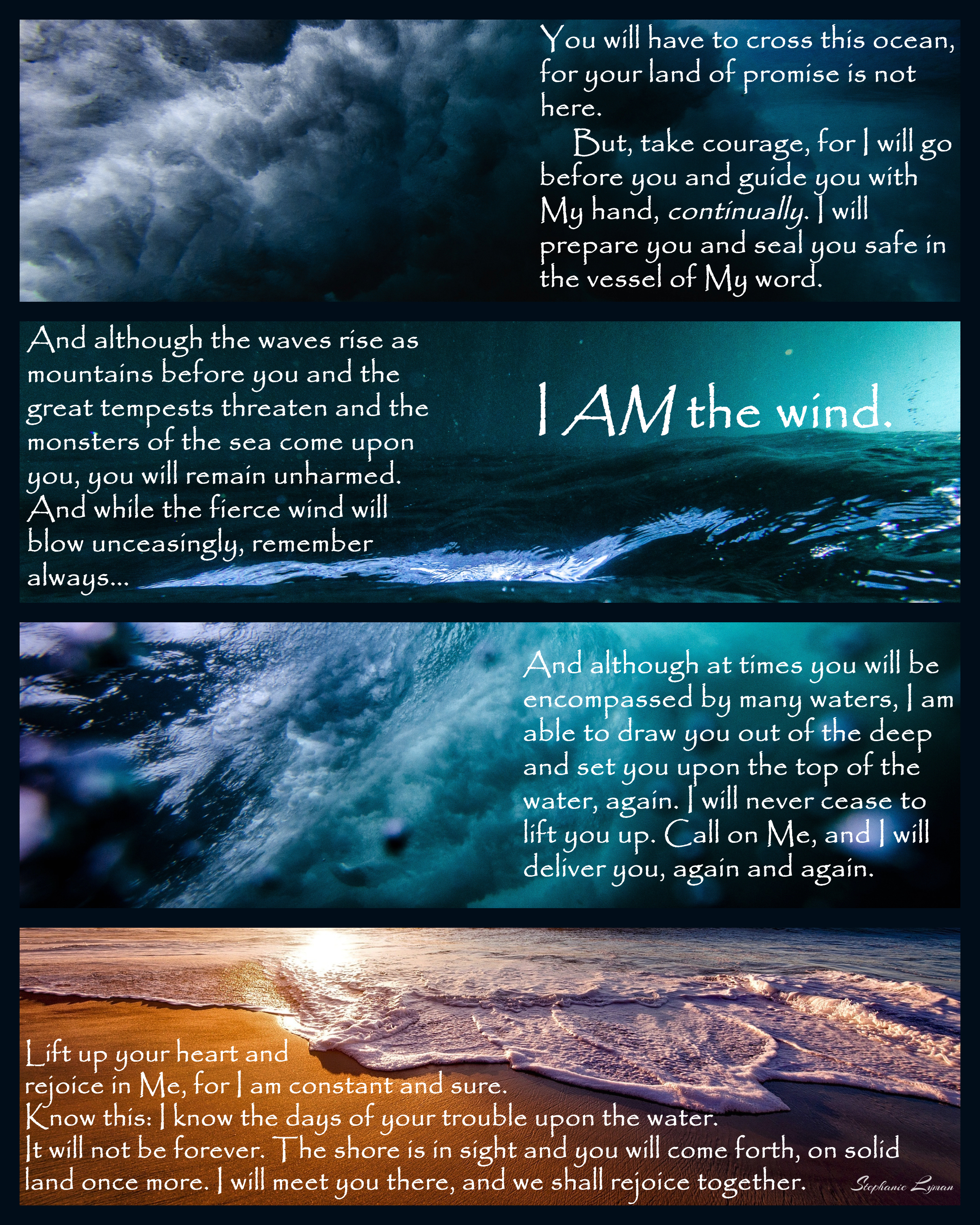 Stephanie, you will not suffer one more day than what is allotted for this trial. Your days on this ocean will not be forever. I know exactly how long it will be, and I promise you, it will not be one...day...longer. Know that I have been with you every single day and will continue forward with you through each and every day. The shore is in sight and you will come forth, on solid land once more. I will meet you there, and we shall rejoice together.